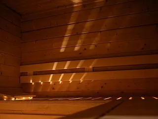 Sauna, jossa on mukavat ja turvalliset lauteet sekä kauniit puupinnat. Sauna näyttää ja tuntuu uudelta, ja siellä on miellyttävä rentoutua.